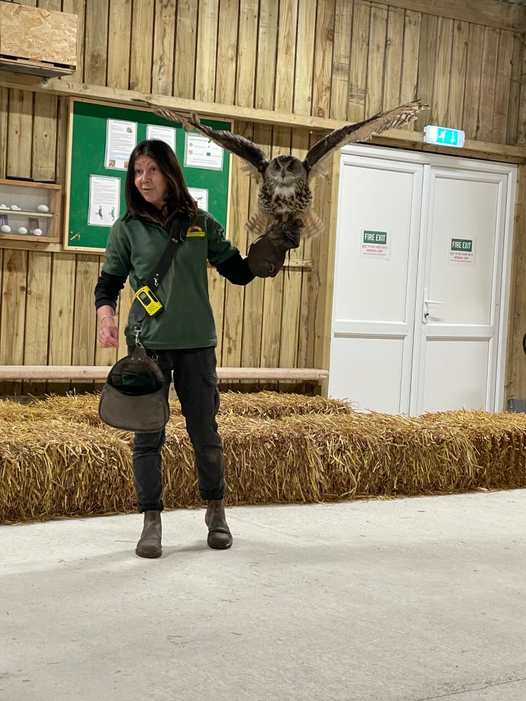We had just enough time to take in the flight demonstration in their barn. With only a few people joining us it was amazing! We saw three birds in total there. A Eurasian eagle-owl was the first to show off his flight skills. “Joe” was an adolescent at 14 years of age weighing in at a little over 4 lbs. Females of the same species can weigh in as much as 14 lbs!