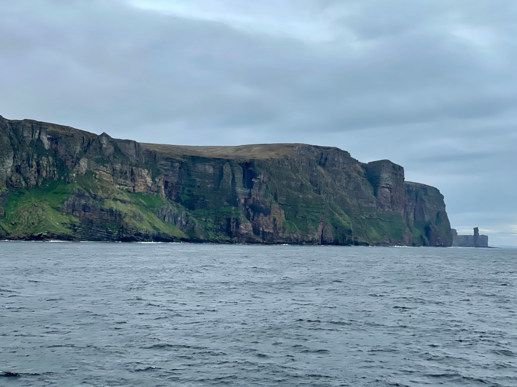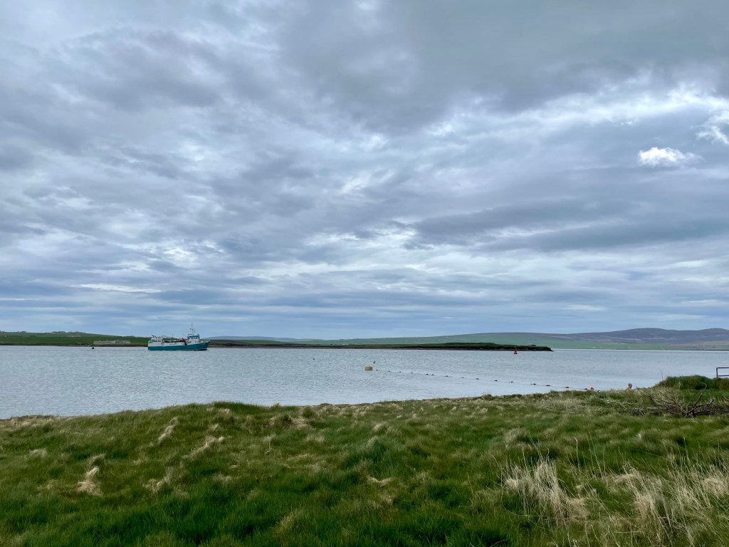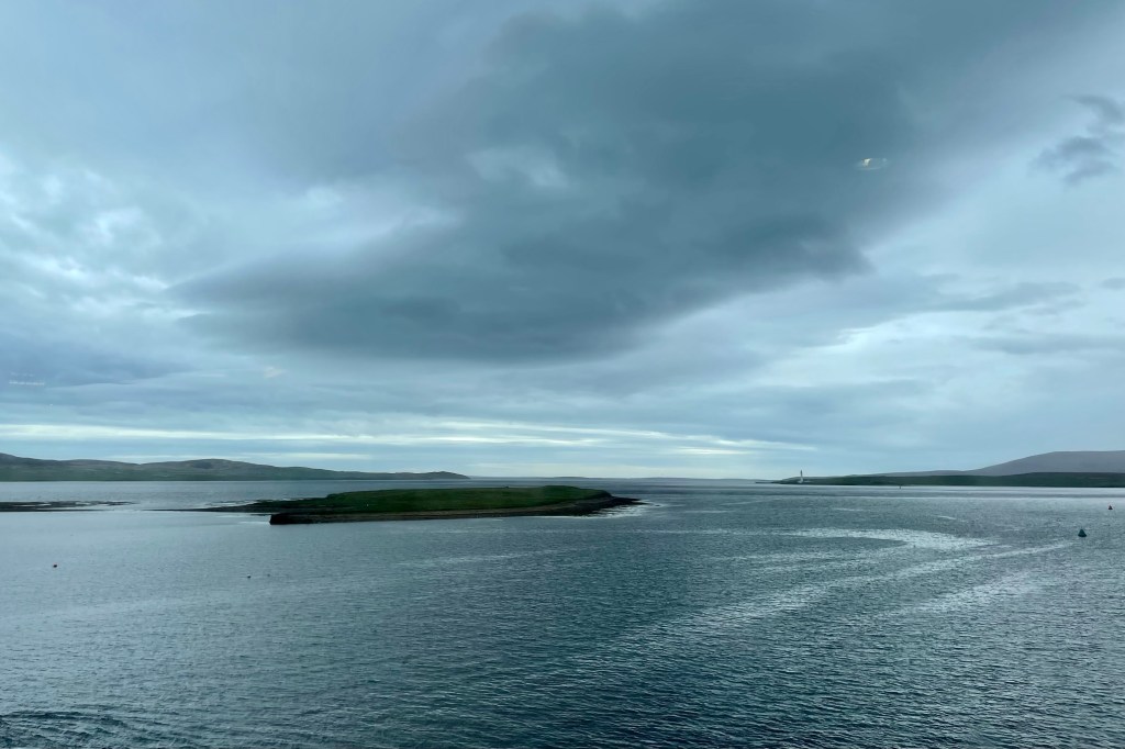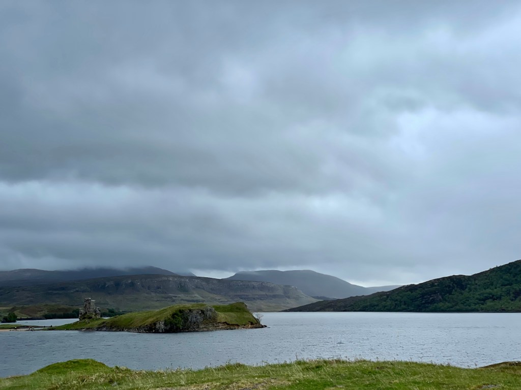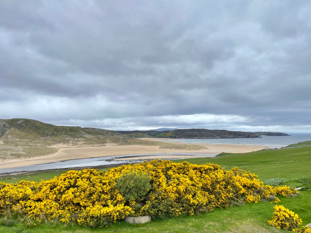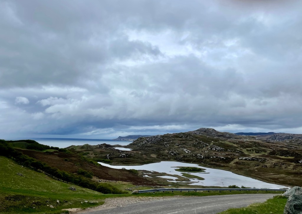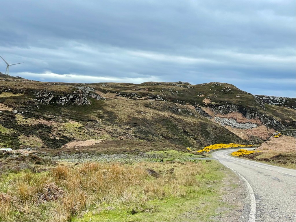 A colourful space saving garden adornment positioned against the drab grey of the stucco.The main drag in Stromness at 10 am!The town is certainly a challenge for drivers!At the end of the quay, I spotted three women having a swim in the ocean while a fishing boat slipped by on the far side of shore. Can you spot their heads as they get out of the water?I returned back to the car in lots of time to see the ferry dock and maneuver for its disembarking passengers.A final view of Scapa flow before we sailed through this harbour on our way to Thurso.One last look at the incredible cliffs of Hoy…you can see the “Old Man of Hoy” off to the right of the shot.Once again we pass by the “Old Man of Hoy”, a 449 foot tall stack (yes about 45 stories). This is the tallest freestanding sea stack in the world.Back on the mainland of Scotland, we began our continuation of our NC 500 drive. You can just see Hoy Island from here, sitting about 8 miles offshore. we stopped here at Strathy Bay for our lunch!At this point, the road became basically a single track for the next 60 miles or so with frequent “passing shoulders”. It meant for alot of stop-starting as we wound our way around the highlands.Another beautiful northern bay at low tideWe knew the sun was out somewhere when we saw the brilliant patch of blue water on the far side of the inlet.Rocky Mountains, icy lochs and the ocean beyond.Incredible vistas as we near the Kylesku Bridge. The gorse again was playing the role of sunshine for most of the day!The Kylesku Bridge is a curved structure flowing over the inlet from Eddrachillis Bay off the Atlantic Ocean on the northwest coast of Scotland.As we approached Ullapool, we saw the remains of Ardvreck Castle near Elphin. the skies provided the perfect backdrop for this ruin.The dramatic skies as we rounded the corner towards Ullapool.As we came down into the town, we spotted the ferry that we’ll be taking to Stornaway tomorrow