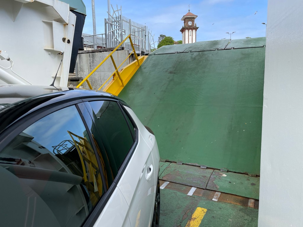 Well, our luck was starting to turn. We though we would have to wait for the next ferry (no big thing) but low and behold, they had room for one more car! Yes, we slipped right in between those two cars where the young man was beckoning!