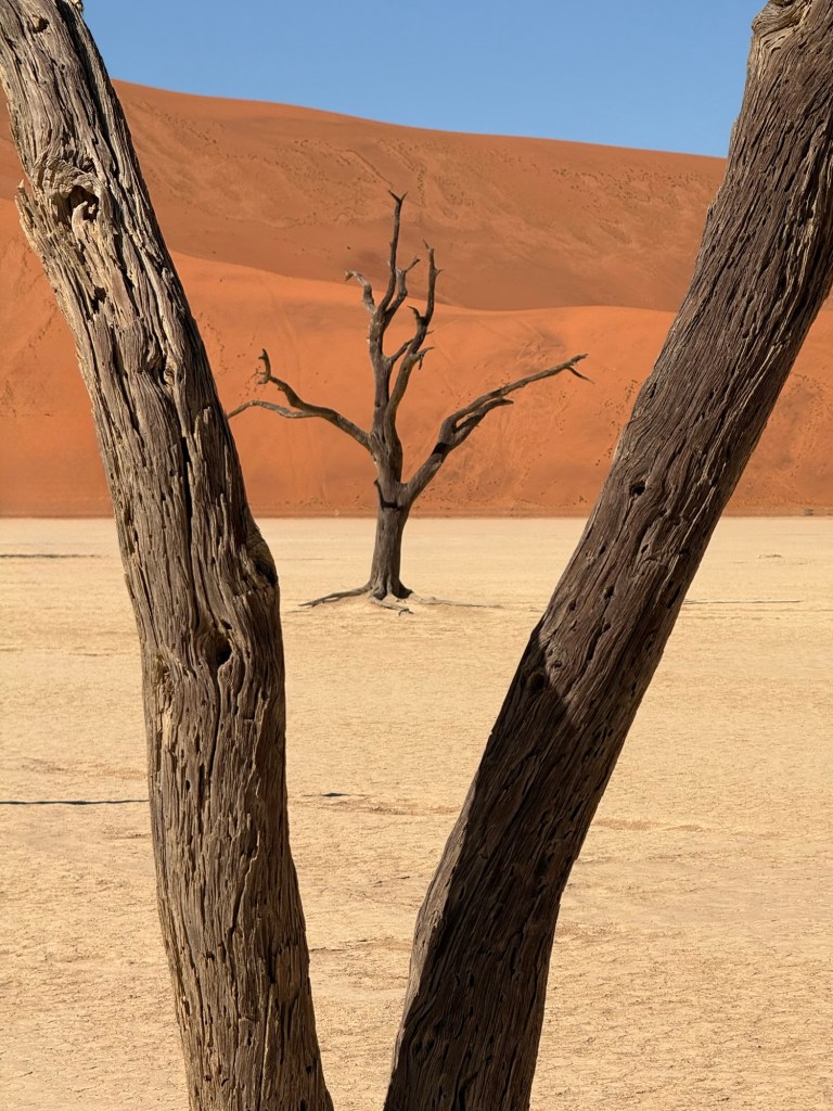 Our first view of Dead Vlei. The acacia trees here died some 900 years ago when the river bed dried up and left nothing but a salt flat. The trees have not rotted as there is not enough moisture to allow this!