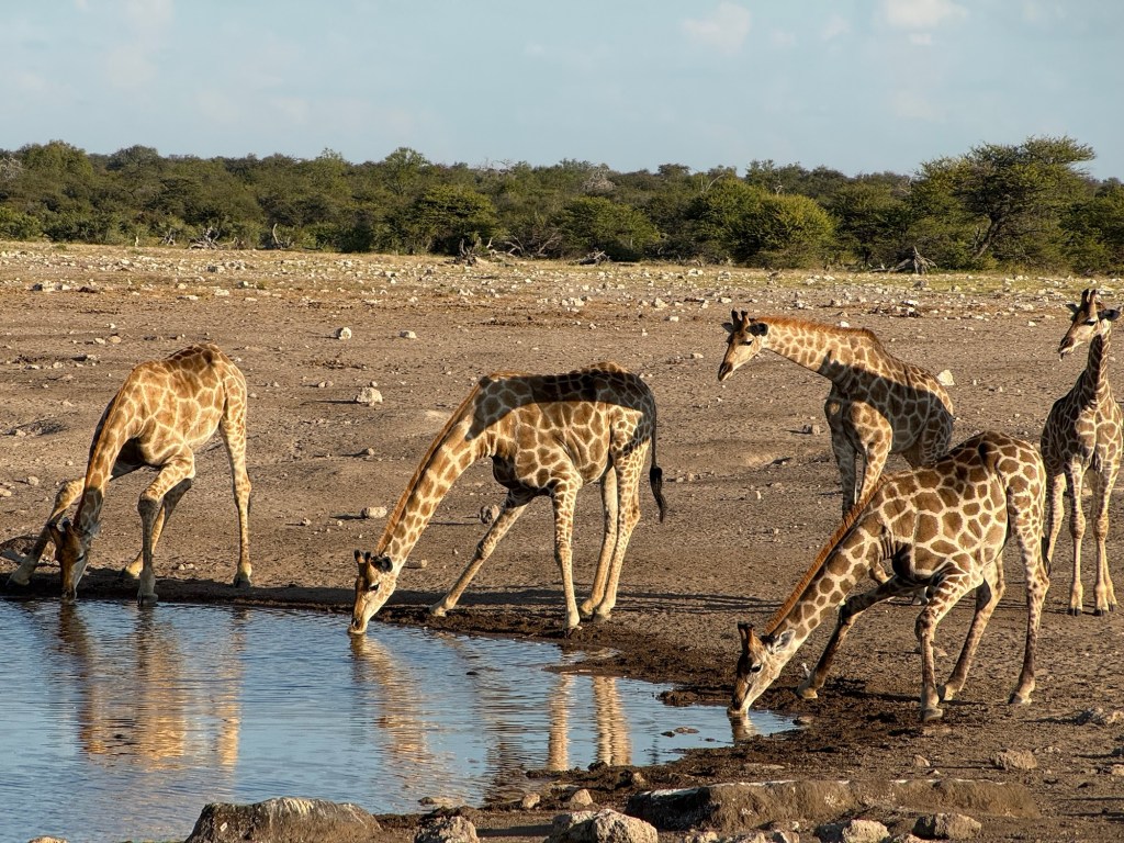 After lunch we had a rest back at our tent and then we headed out to Chudop waterhole one last time before sunset. We weren’t disappointed! Tonight brought a menagerie of animals including a herd of wildebeest, zebras and black faced Antelope. The biggest thrill was a herd of extremely cautious giraffes (7 in total) that approached the waterhole to drink. When the giraffe drinks it must splay its legs to get its neck down low enough for the water. In this vulnerable position a lion can take it down by knocking it over and going for the neck and head. When standing giraffes have incredible defense mechanisms with their hind legs kicking…plus the fact that’s it’s so tall it’s even hard to attack its belly. Our guide told us that it is rare to see lions take down a giraffe unless there is a large number of lions that need feeding.