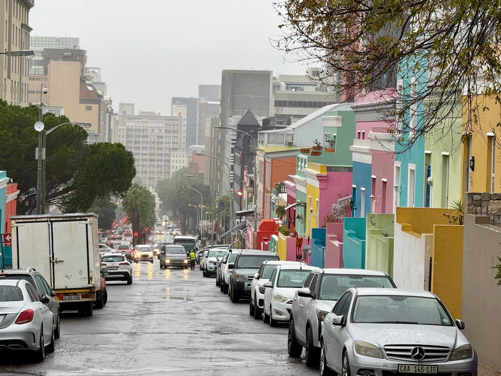 Down we went to explore the city. We all believed that the day would clear and we would be able to get some vistas from somewhere. In the meantime, we headed into the city to an area called Bo Kaap. This area is known for its colourful houses. These houses were once the residences of slaves and they had to be white to match their owners estates. However, once they were freed and were able to buy their home, they had a revolution with colour.