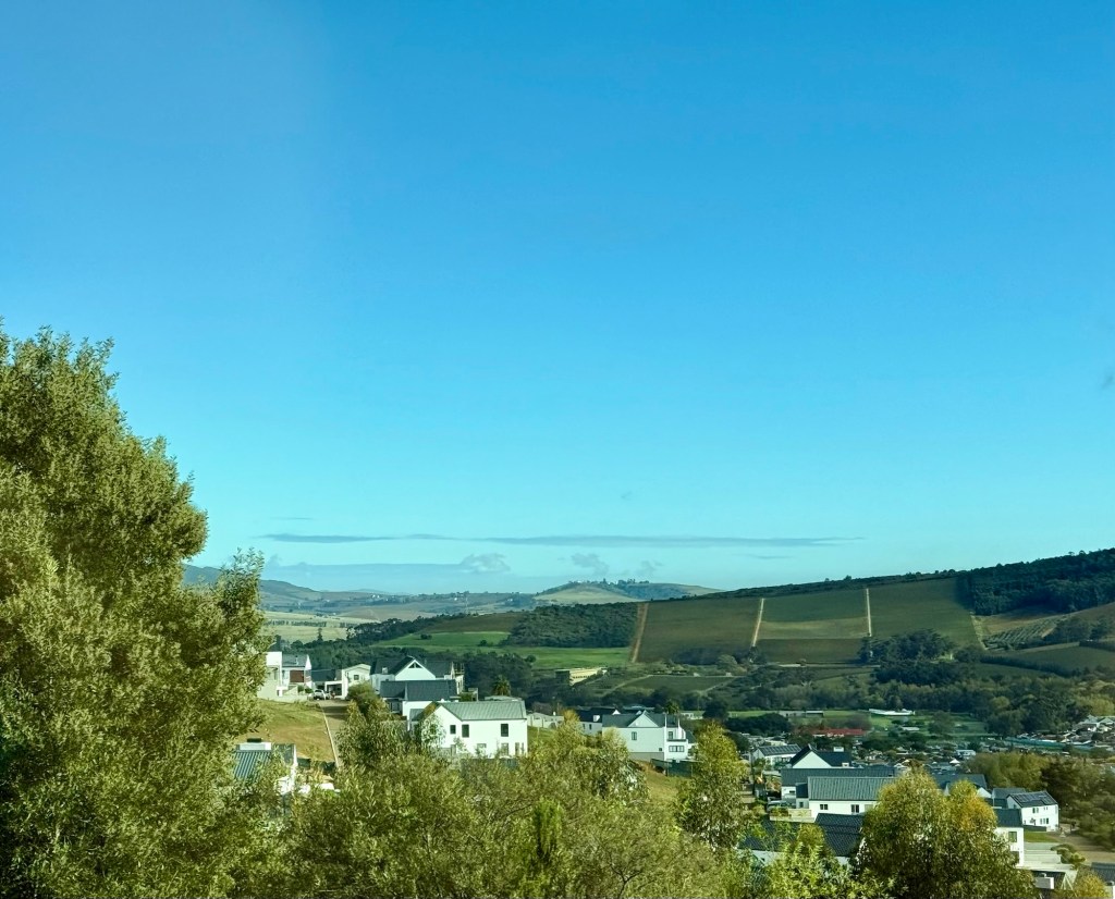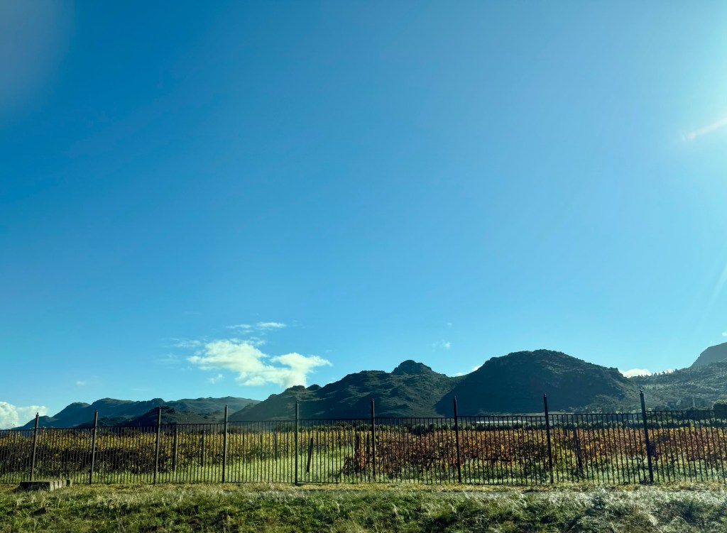 The sun decided to shine today, and it was a fine drive through the Towns of Franschhoek and Stellanboch on our way to the airport.