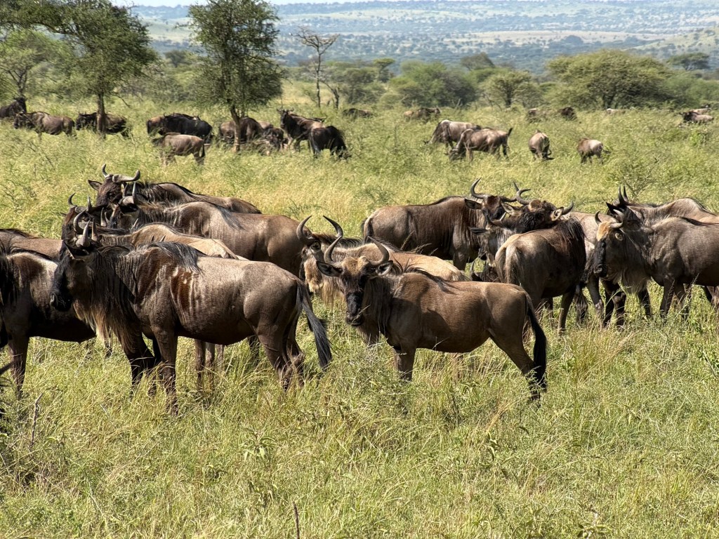 The first thing we encountered was yet another grouping of the herds of wildebeest. This also contained many zebras as well. These two species travel together throughout the entire migration. About 1 million wildebeest and 300,000 zebras do the trek each year. This collection of herds went on for miles, each wildebeest and zebra herds with their our dominant male, constantly fending off advances from other males… makes for an active day for the dominant male. Apparently , on average a male doesn’t stay dominant for more than 3 years… he then “retires” and joins a male only herd,