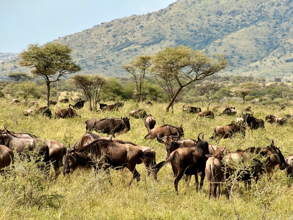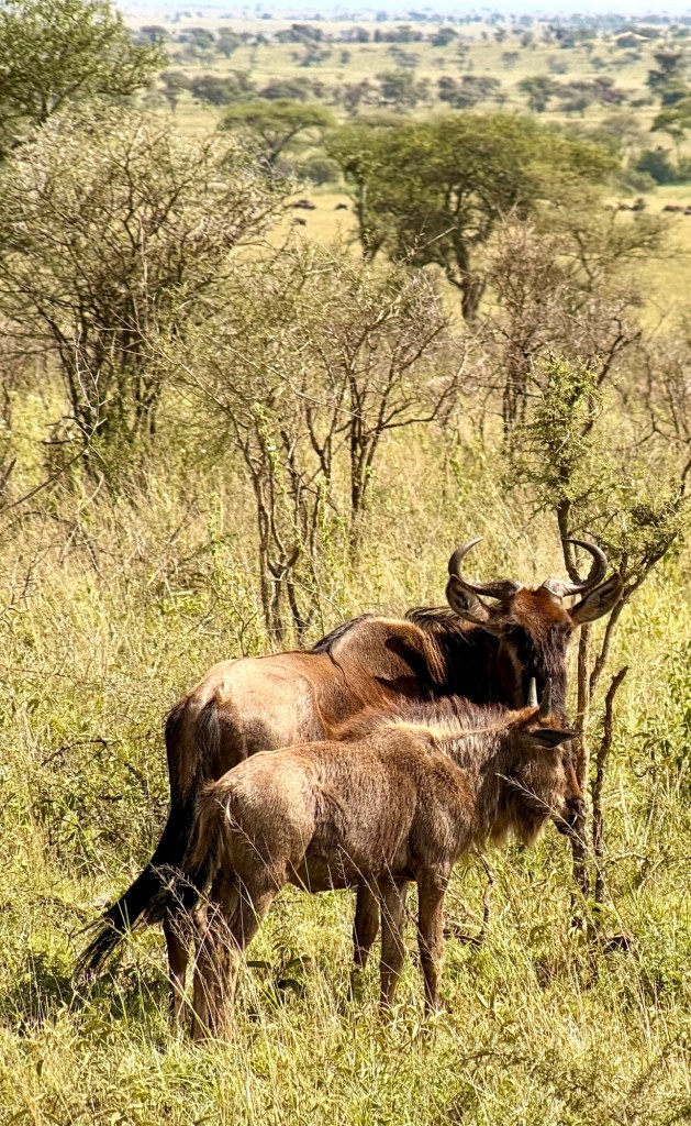 After lunch we spotted another vulture, totally posing for us! We also saw a small herd of zebras standing in front of “Pride Rock”, and our first water buffalo along with a beautiful herd of Topi. Our afternoon was rounded out with a cute mother daughter photo op of wildebeest.