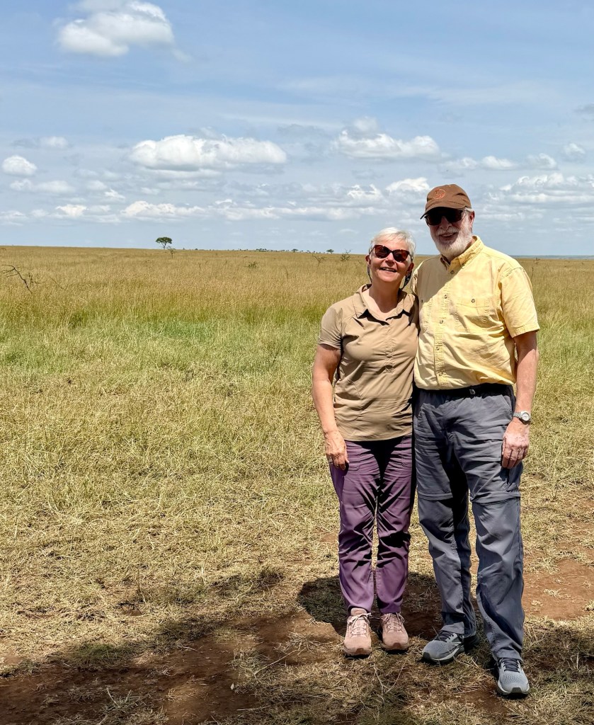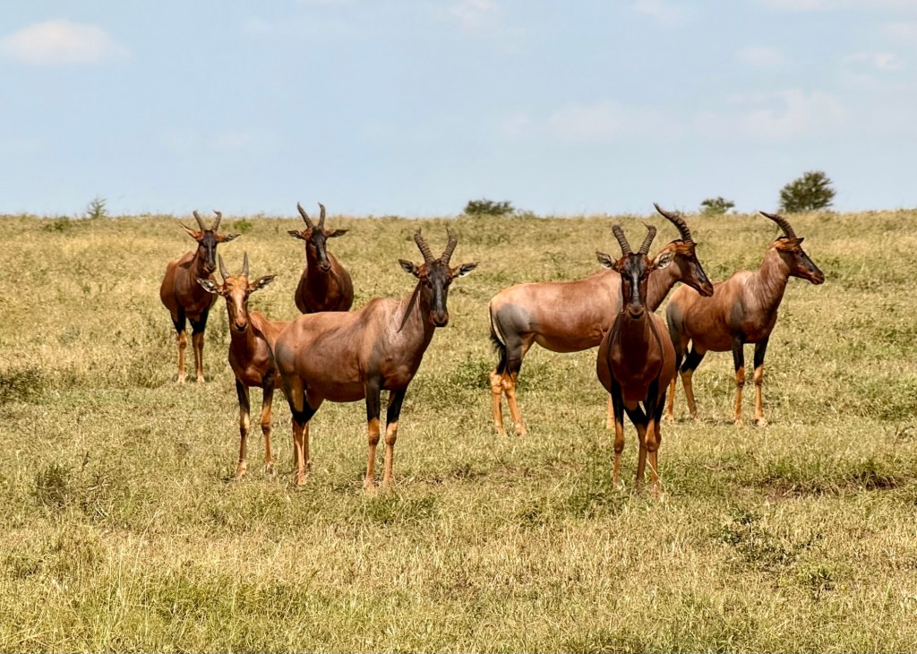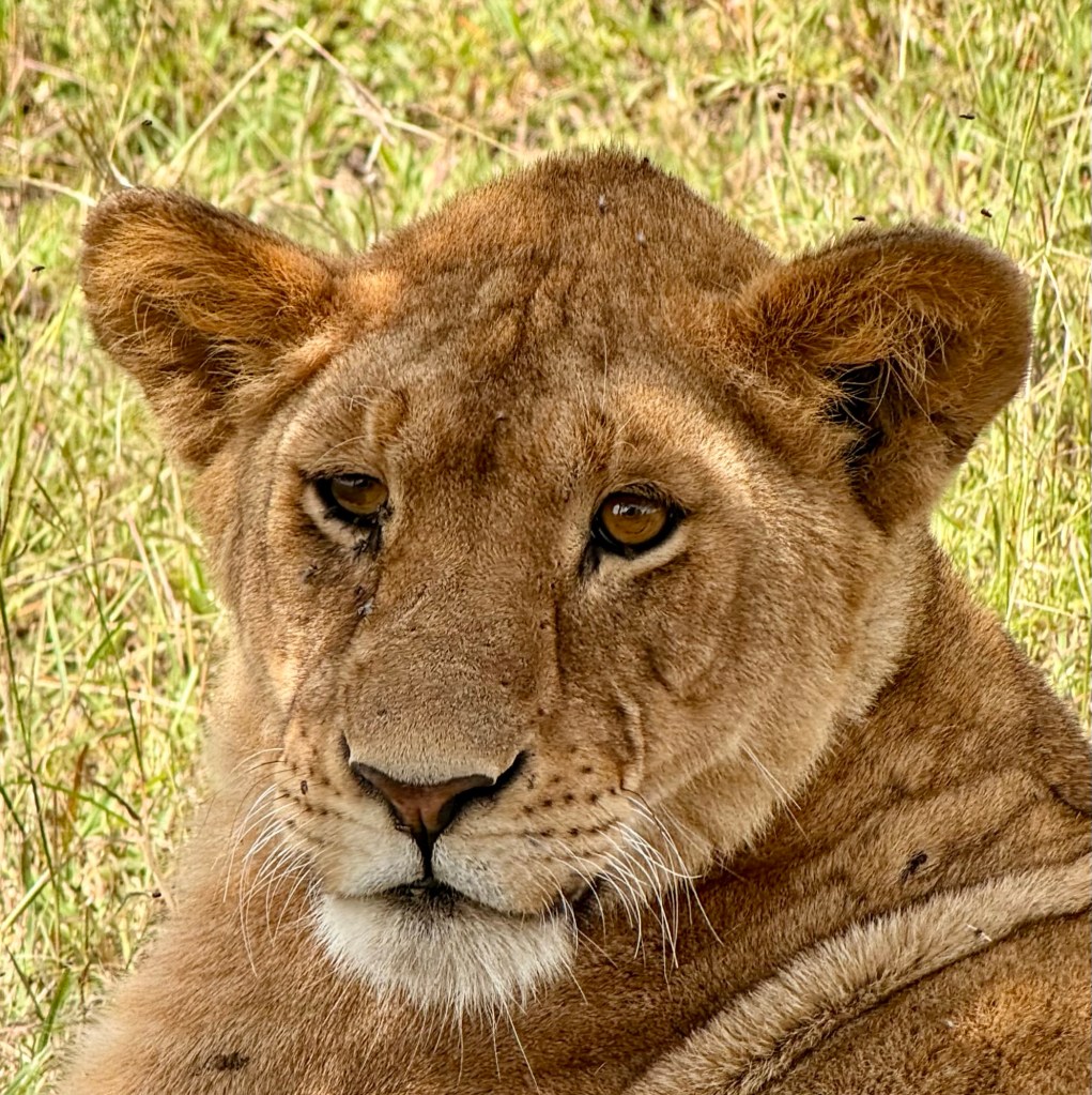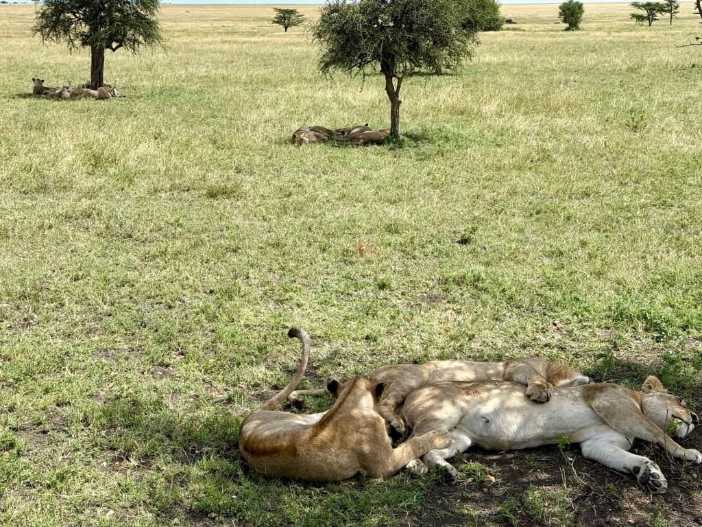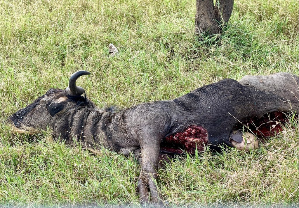 After the wildebeest herd we saw many many more animals. I started a list in the am and here’s what I had before lunch: Wildebeest, zebras, topi, giraffes, ostriches, impalas, both Grant and Thompson Gazelles, wart hogs, Lions and LIONS including a lion sleeping near her wildebeest breakfast, Spotted Hyenas, Wart Hogs, and vultures. Phew! So many pictures, and so much awe at the beauty of life that surrounded us today.