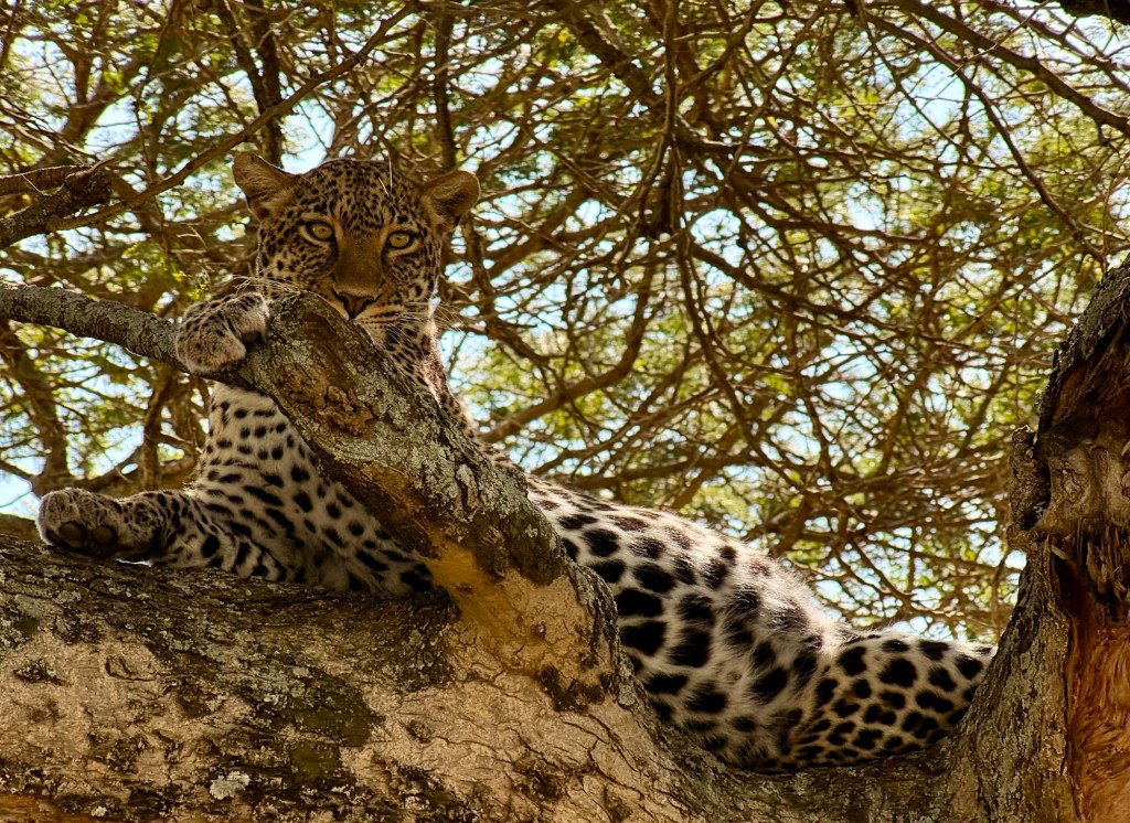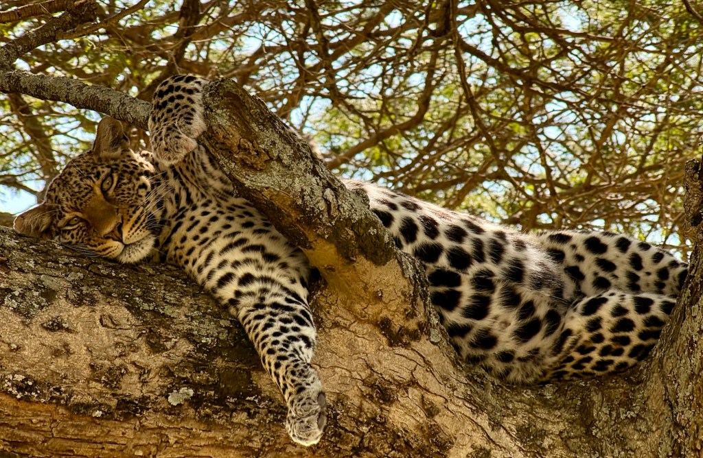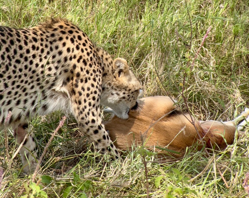 Soon after this, David got a call that there was a leopard sighting so off we went. David told us yesterday that Leopards and Cheetahs share the same territory, so it’s not uncommon for either cat to prey on the young of the other to try to manage the territory. Well, this morning was a lesson in spades!
