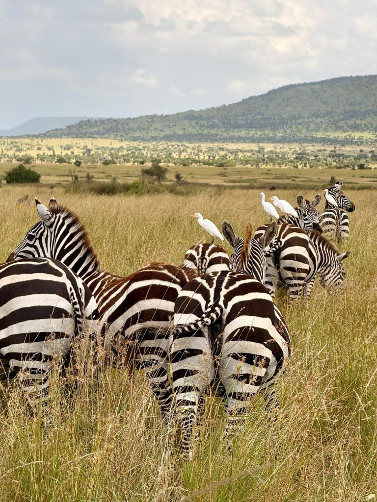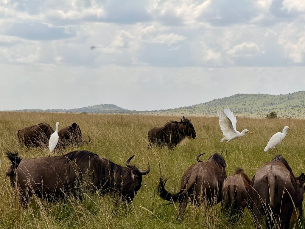 Leaving the picnic area, we headed back down the hill and through the tall grass and came upon some more wildebeest and zebras. Only this time they had hitchhikers!