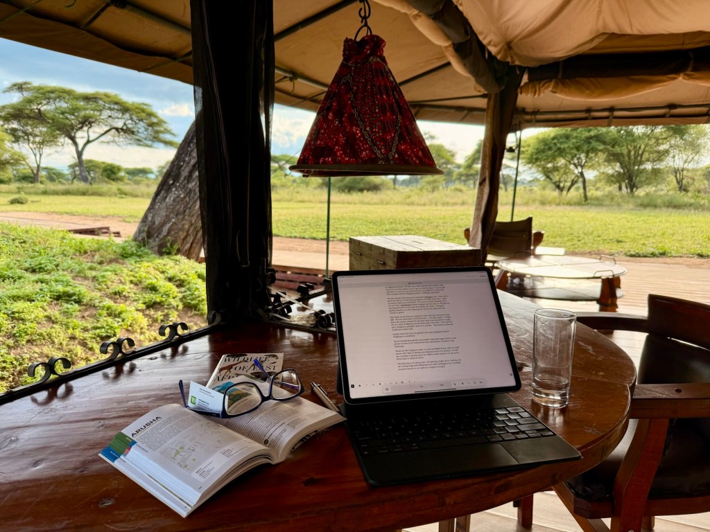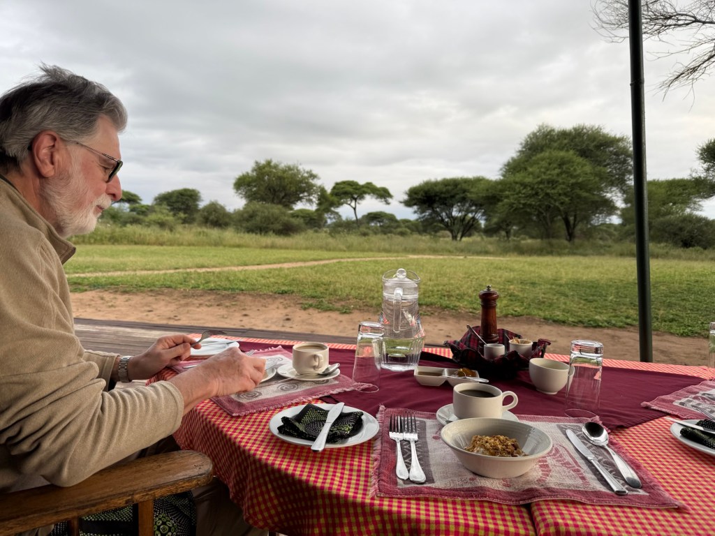Today they set us up under a beautiful Acacia tree in front of the reception area for our lunch. Chilled cucumber soup followed by spaghetti and Tanzanian tomato sauce, beef skews and avocado stuffed tomato. For desert we had a puréed papaya, mango and bananas…lovely! I’ll tell you, sitting on game drives and eating like we’re running a marathon is not doing our waistline any benefits, but we are enjoying ourselves!