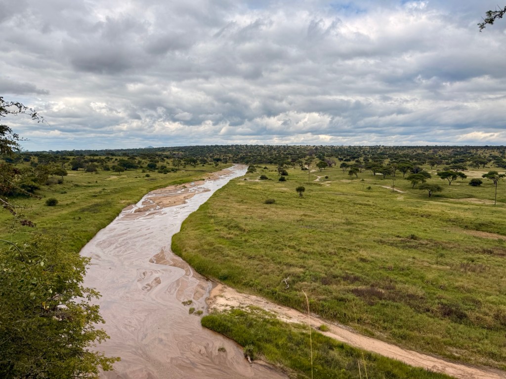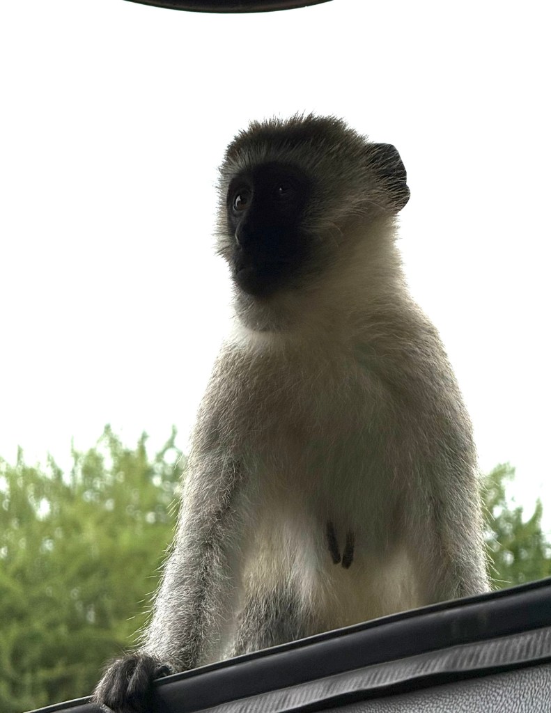 We also took an interesting drive along the Tarangire river. First with a quick pit stop at a lovely picnic ground on one side of the river. Here we almost licked up a hitchhiker! We were no sooner heading out of the car, than a blackfaced monkey hopped onto the roof, in through our opening and down on the back seat beside the cooler. Our guide quickly chased it out and closed up the roof so we could leave the vehicle in peace!