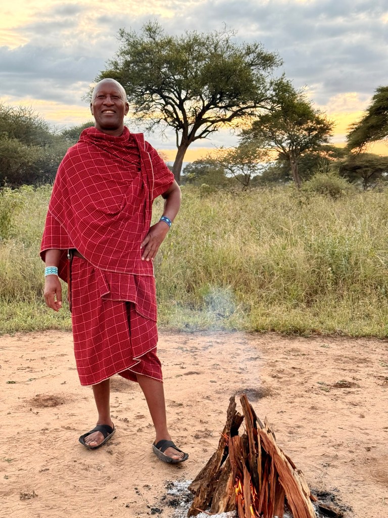Dan and I had a lovely evening at our new home. After arrival and some r and r, we headed to the campfire to watch some bush TV! It was lovely to be served a cool glass of wine while sitting by the campfire and watching the sun go down. Our view over the grassland was lovely. And once darkness fell a Maasai kept us all safe while he was on alert. (Indeed, the rule again was: No venturing outside of your tent at night without signaling the Maasai security for an escort!)